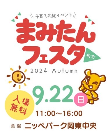 株式会社関西ぱど(本社:大阪市西区靭本町1-10-24 三共本町ビル5F 代表取締役 富岡 紀幸)は、2024年9月22日(日)に、京阪枚方市駅下車スグのニッペパーク岡東中央と枚方市役所前スペース(予定)において、「体験・体感・学びを通じて子育てファミリーが1日楽しむ!!」をモットーに、子育て世代応援イベント「まみたんフェスタ枚方~2024 Autumn~」を開催いたします。