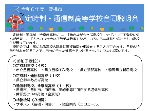 豊橋市は平成24年度より、定時制・通信制高等学校の合同説明会を年2回開催。今回で23回目の開催となります。