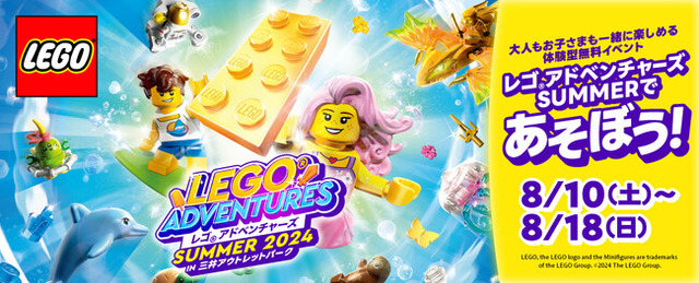 三井不動産商業マネジメント株式会社(東京都中央区)が運営する、三井アウトレットパーク11施設では、2024年8月10日(土)~8月18日(日)の期間中、レゴジャパン株式会社(東京都港区、以下レゴジャパン)とのコラボレーションイベント「レゴ(R)アドベンチャーズ SUMMER 2024 in 三井アウトレットパーク」を開催いたします。