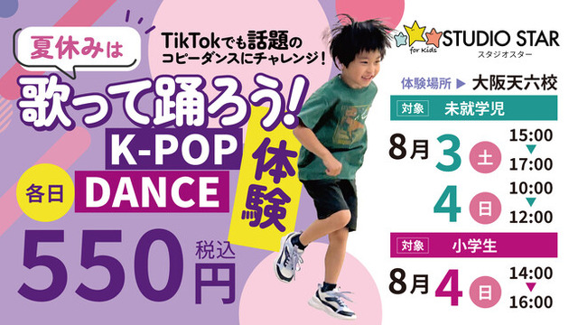 SDエンターテイメント株式会社(北海道札幌市、代表取締役社長 高橋 誠 東証スタンダード4650)が運営する「スタジオスター大阪天六校」では、2024年8月3日(土)・4日(日)に未就学児と小学生を対象とした「K-POPダンス体験」を開催します。