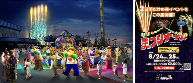 日本一のキッズリゾートを目指すレゴランド(R) ・ジャパン・リゾートでは、普段入ることのできない「夜のレゴランド」を楽しめるナイトイベントを、春夏秋冬のシーズン毎に日数限定で実施。この夏は、8月24日(土)・8月25日(日)の二夜限定で、子どもたちが思いっきり夜のお祭り気分を楽しめる「まつりナイト」を初開催いたします。