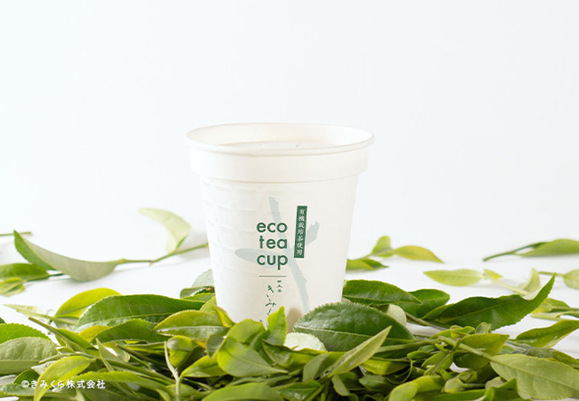 プラスチック使用料削減を目指したペットボトルにかわる持続可能な商品の提案、それがエコティーカップです。カップはもちろん蓋にも紙素材を使用しました。ペットボトルのお茶に比べプラスチック使用料を89%以上削減しています。また印刷のインクも1色にこだわり、できるだけ簡素化。デザイン面でも環境に配慮しています。