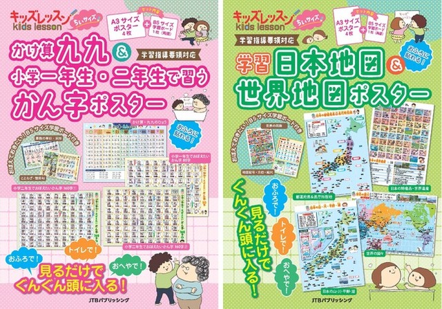 JTBグループで旅行・ライフスタイル情報を提供する株式会社JTBパブリッシング(東京都江東区、代表取締役 社長執行役員:盛崎宏行)は、「キッズレッスン」シリーズの新商品として『キッズレッスン ちいサイズ かけ算九九&小学一年生・二年生で習うかん字ポスター』『キッズレッスン ちいサイズ 学習日本地図&世界地図ポスター』を2024年7月19日(金)に発売いたします。