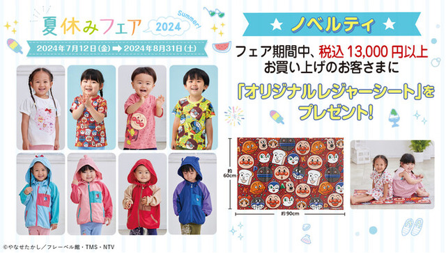 これに合わせて、店頭およびバンダイナムコグループ公式通販サイト「プレミアムバンダイ内アンパンマンキッズコレクションオンラインショップ」( https://p-bandai.jp/anpanman-kids/ )では、2024年7月12日(金)より、対象商品を13,000円(税込)以上お買い上げのお客様に「オリジナルレジャーシート」をプレゼントするキャンペーンを開始いたします。