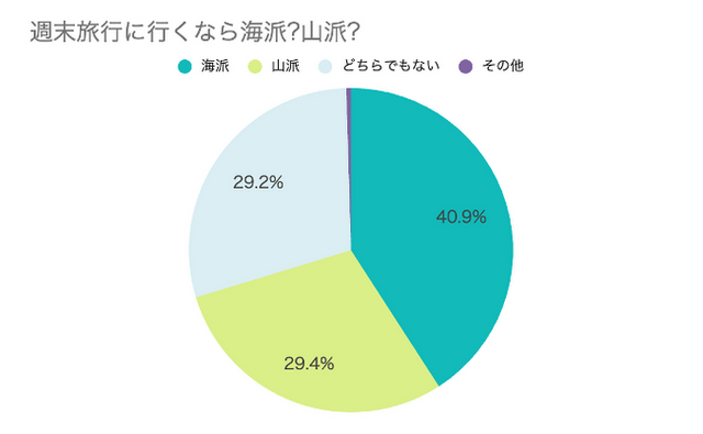 関東一都六県に住む20代~50代の男女約1,000名に週末旅行で行きたいのは海か山かを調査したところ、海派が40%以上、山派が約30%と海派が若干優勢となりつつも拮抗する結果となりました。