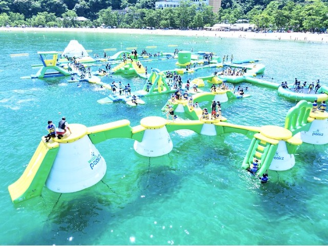 洲本温泉街の中にあるため泊りがけでゆっくりと海水浴を楽しむにも最適 日本で1番気持ちいい、日本で1番手をたたいて爆笑してしまう国内最大級の海上アスレチックがまたさらに大きく拡大!