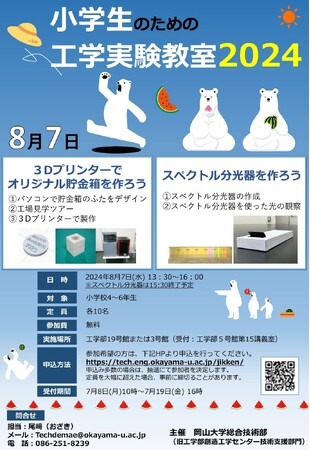 国立大学法人岡山大学(本部:岡山市北区、学長:那須保友)の技術統括監理本部のひとつである総合技術部は、2024年8月7日(水)に本学津島キャンパスの工学部で「小学生のための工学実験教室 2024」を開催します。