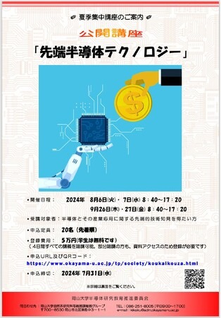 国立大学法人岡山大学(本部:岡山市北区、学長:那須保友)では、本学津島キャンパスにおいて公開講座「先端半導体テクノロジー」を4回シリーズで開催します。