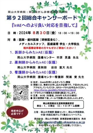 今回、第92回総合キャンサーボード「irAEへのより良い対応を目指して」を2024年8月30日(金)にオンラインで開催します。
