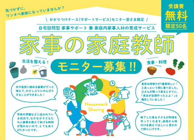 本事業では、子育て世帯が一人で不安不調を抱え込むことなく、安心して健康的な暮らしを営むことを目的とし、かかりつけナースチャットサポートと家事サポーターによる家事の家庭教師を対象地域在住のモニター子育て世帯200名に対し実施します。実施にあたり、かかりつけナースチャットサポートと家事の家庭教師のモニターを募集します。