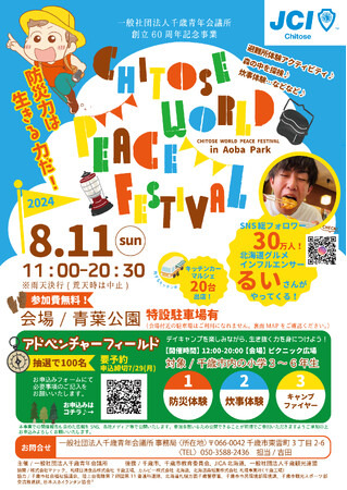 一般社団法人千歳青年会議所(北海道千歳市、理事長 斉藤 創)は千歳市民の憩いの場である道内屈指の自然豊かな総合公園『⻘葉公園』を舞台に「CHITOSE WORLD PEACE FESTIVAL」を2024年8月11日(日)に開催いたします。本事業は次世代のリーダーを生み出すべく、千歳市の子供たちが楽しみながら生き抜く力を身につける防災教育や、市内在住の外国籍との方と異文化交流の場を通して多様な価値観の理解とコミュニケーション力を高める場を創出します。自然と本事業の共生や仲間と共に過ごす時間によって、千歳の美しい自然環境を後世につなげ、郷土愛を育み、原体験を通して社会への適応力と多様性を尊重できる人財としての成長に寄与します。