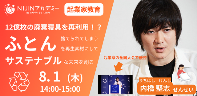 粗大ごみと再生素材の課題を解決するyuni代表内橋堅志先生から、サステナブルな未来の創り方を学びます。