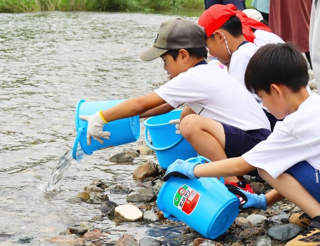 アユは稚魚で放流した後、上流へと遡上。夏ごろには成魚になり、やがて産卵のために下ってくるといいます。子どもたちは手でアユをつかんで放流するなどした後、小さな稚魚が元気に育つよう願いながら、周辺のごみ拾いなど河川の清掃も行いました。