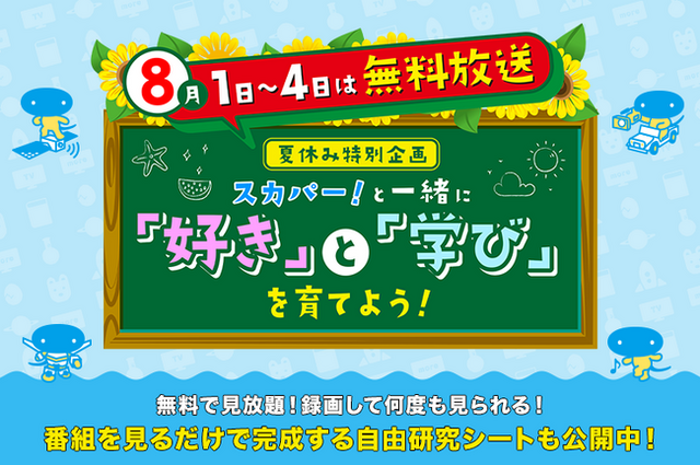 スカパー! は8月1日(木)~ 4日(日)の4日間は、夏休み特別企画『スカパー! と一緒に「好き」と「学び」を育てよう!』として、自由研究に役立つ番組の『特別無料放送』を実施。特設サイトより自由研究としてそのまま提出ができる、「自由研究シート」もダウンロードが可能!化学・恐竜・動物・歴史・宇宙など、スカパー! で番組視聴していただき研究シートにまとめるだけで、夏休み中の自由研究のお悩みの解決ができます!