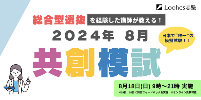 Loohcs株式会社(代表取締役 : 嶺井祐輝 本社所在地 : 渋谷区桜丘町)は、同社運営のLoohcs志塾福岡天神校舎で、総合型選抜で九州大学共創学部の合格を目指す高校生・既卒生を対象とした特別対策「8月共創模試」を2024年8月18日(日)に開催致します!