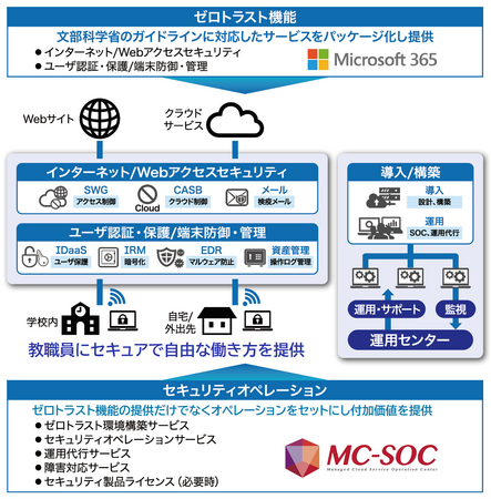 ゼロトラスト環境の導入に際して、インターネット等の外部通信へのアクセスを安全に行うSWG※3や端末の振る舞い検知を行うEDR※4、及びMicrosoft 365※5を利用した校務環境の構築、セキュリティ監視や一次対応等の運用管理をパッケージ※6で提供します。