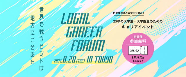 都市と地方の人材流入を逆転させ、地方企業が都市部の複業プロ人材を採用する地方特化型のダイレクトスカウトサービス「チイキズカン」を運営する株式会社XLOCAL(本社:山形県鶴岡市、代表取締役:坂本大典)はこの度、25卒予定の大学生や大学院生を対象に、将来のキャリアの新しい選択肢として、新卒入社後の3年間でいつでも地方企業で働ける(複業可)「3年入社パス」が獲得できるLOCAL CAREER FORUM 2024を2024年8月20日(火)にPOTLUCK YAESUで開催いたします。