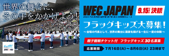 富士スピードウェイは、9月13日(金)から15日(日)に開催される2024 FIA世界耐久選手権第7戦 富士6時間耐久レース『WEC JAPAN / 6HOURS OF FUJI』において、9月15日(日)の決勝レース当日に、スターティンググリッド上で国旗を掲げ、会場を一緒に盛り上げてくれる「フラッグキッズ」30名を募集いたします。