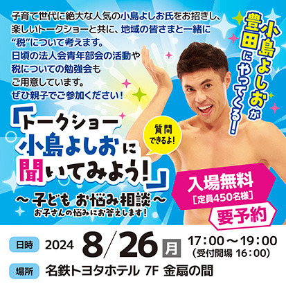 公益社団法人豊田法人会青年部会(所在地:愛知県豊田市、会長:宮崎洋一)は、2024年8月26日(月)17:00から、トークショー「小島よしおに聞いてみよう!~子どものお悩み相談~」を名鉄トヨタホテル(豊田市喜多町1-140)にて開催いたします。