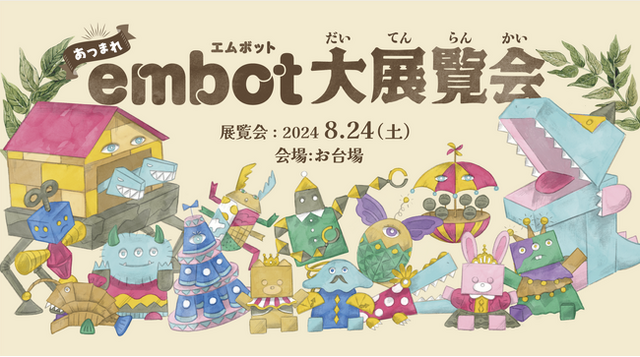 誰でも参加できるembot大展覧会が開催されます!自由な発想で作った作品は、embot図鑑に掲載されちゃう!会場では参加者全員が気に入った作品に投票!獲得票数が多い作品には素敵な賞がもらえるよ!