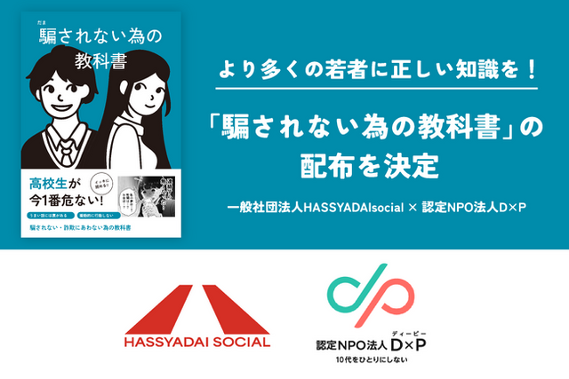 「Choose Your Life!それでもなお、人生は選べる。」をスローガンに掲げる一般社団法人HASSYADAI social(本社:東京都港区、代表理事:勝山恵一 三浦宗一郎、以下ハッシャダイソーシャル)は認定NPO法人D×P(ディーピー)と連携し、「騙されない為の教科書」の配布を行います。
