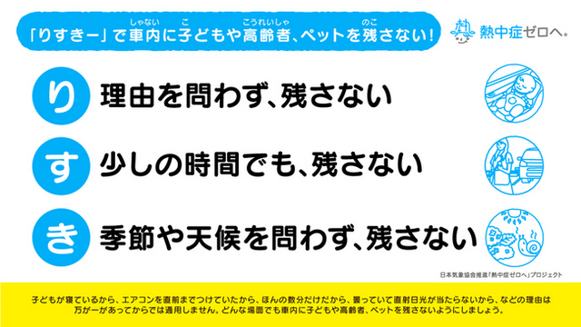 (https://www.netsuzero.jp/learning/le21)を、本プロジェクト公式サイトで2024年 7 月 17 日 (水)に公開します。またJAF監修のもと、車内置き去りの注意喚起を促す標語「りすきー」を新たに 発表します。