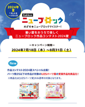 Gakkenニューブロックは誕生から半世紀を超え、発売当初から変わらぬブロックの形で親子3世代にわたり愛されてきた学研のロングセラーブロックです。無限に広がるニューブロックの可能性を、ニューブロックファンの方々と共有し、ニューブロックの魅力を更に広めていくことを目指しています。コンテストの詳細はホームページ(https://newblock.jp/sakuhincontest2024/)にてご覧いただけます。