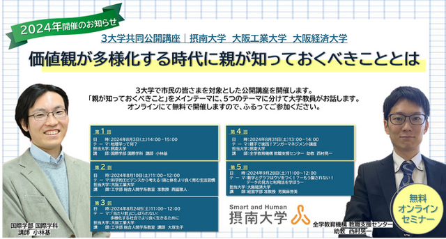 摂南大学(学長:久保康之)は、8月3日から大阪工業大学・大阪経済大学と3大学共同で、無料のオンライン公開講座を開催します。メインテーマを「親が知っておくべきこと、シェアしませんか?」とし、各大学の専門家がさまざまな視点で全5回にわたり講演します。