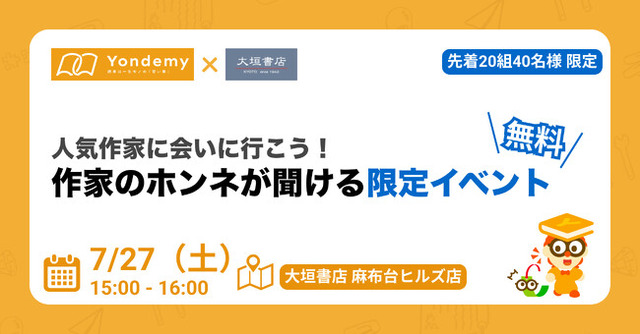 子どもが読書にハマるオンライン習い事「ヨンデミー」を運営する株式会社Yondemy(本社:東京都中央区、代表取締役:笹沼 颯太)は、大垣書店とのコラボ企画として、作家・清水晴木との小学生向けワークショップを2024/7/27(土)に大垣書店麻布台ヒルズ店で開催いたします。 動画世代の子どもたちの本選びをサポートするYouTube「ヨンデミーちゃんねる」開設記念として、子どもたちがより本を読むのが好きになるようなワークショップ、そして清水晴木と笹沼颯太の対談イベントを実施いたします。 つきましては、本イベントの参加申し込みの募集を、受付開始いたします。