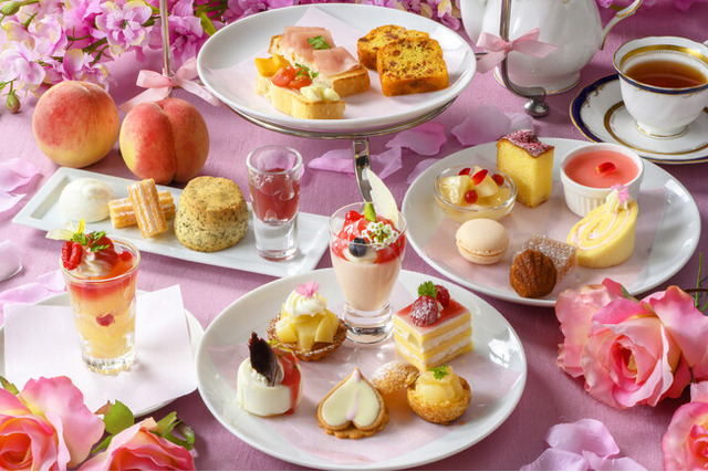 桃のアフタヌーンティーでは、桃とベリーのタルトレットや赤桃ソースのパンナコッタ、桃のコンポート、桃のマカロン、桃のパウンドケーキなど、桃づくしのスイーツをご堪能いただけます。