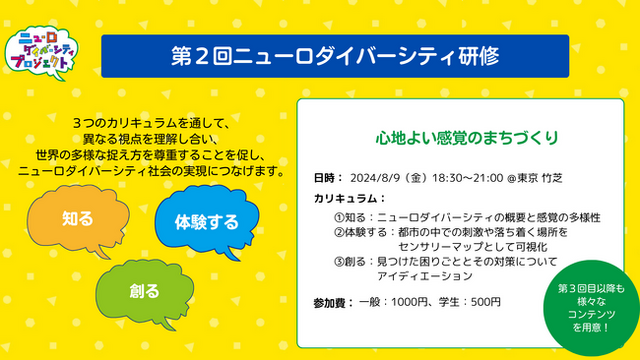 B Lab(所長 石戸奈々子)が主催する「ニューロダイバーシティプロジェクト」は、脳や神経の多様性を尊重し、誰もが自分らしく力を発揮できる社会の実現を目指しています。第2回ニューロダイバーシティ研修では、「心地よい感覚のまちづくり」をテーマに知る・体験する・創るの3つのカリキュラムを通じて、多様な視点を理解し、異なる捉え方を尊重することを促進します。