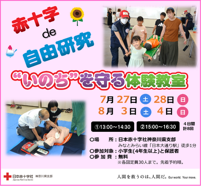 夏休み中の小学生と保護者を対象に、「赤十字de自由研究“いのち”を守る体験教室」を開催します。