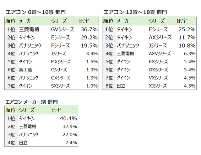 低価格モデルが人気の「6~10畳」部門では、当社最安値モデルの三菱電機GVシリーズが1位を獲得。ブランド力で1位を守り続けていたダイキンEシリーズが初めて陥落しました。