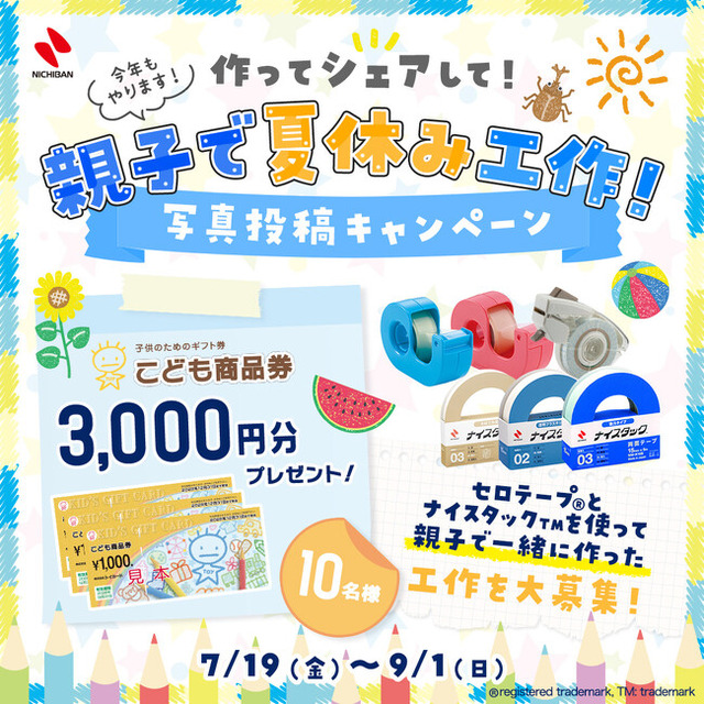 ニチバン株式会社(本社:東京都文京区、社長:高津敏明)は、夏休みの親子工作を盛り上げるキャンペーンとして、昨年度に引き続き、「作ってシェアして!親子で夏休み工作!写真投稿キャンペーン」を2024年7月19日(金)より実施いたします。