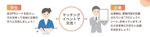 学生の自己PR及び受入企業の業務内容等の案内の場として交流会を実施。交流会後に学生と企業、双方の希望をヒアリングしマッチングを行います。