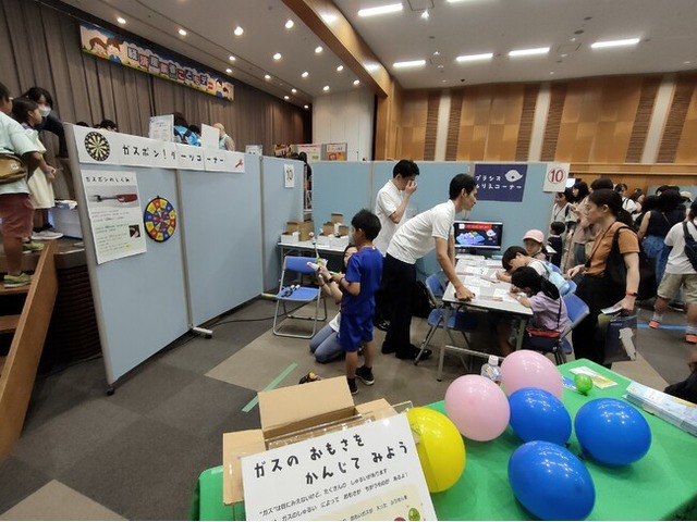 当社ブースでは、「ガス」っていったいどんなもの?というテーマで、可燃性ガスの爆発の力を利用したダーツや風船によるガスの重さ比較、一酸化炭素検知機能付き火災警報器「PLUSCO(プラシオ)」の塗り絵などを実施します。