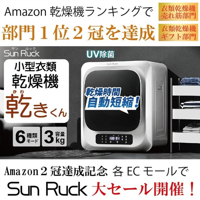 一芸特化型家電を多く展開するプライベートブランドSunRuck(サンルック、販売元:イー・エム・エー株式会社 宮城県大河原町)は2024年7月18日(木)にAmazonにて衣類乾燥機ランキングで2冠※を達成しました。