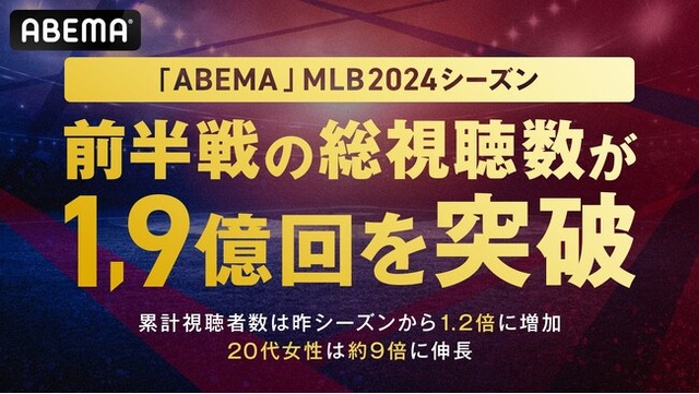 新しい未来のテレビ「ABEMA(アベマ)」は、2024年3月20日(水)のロサンゼルス・ドジャース開幕戦から生中継した「メジャーリーグベースボール」(以下、MLB)の2024シーズンにおいて、7月15日の前半戦終了時点で、総視聴数が1.9億回を突破しました。さらに、累計視聴者数は昨シーズンから1.2倍に増加し、特に20代女性の視聴者が約9倍に伸長したことをお知らせいたします。(※)