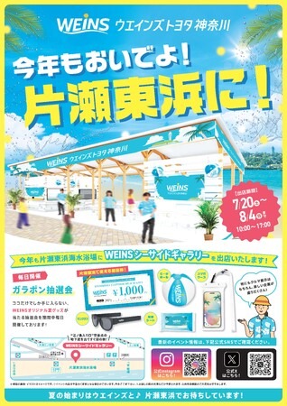 ウエインズトヨタ神奈川株式会社(本社:横浜市中区/代表取締役社長:宮原 漢二)は、地元の方々と共に地域の活性化に繋げられるよう、観光地としても有名な江の島を臨む日本屈指のリゾート海岸である片瀬東浜海水浴場に、昨年に引き続き専用ブース「WEINS(ウエインズ)シーサイドギャラリー」を期間限定で出店します。