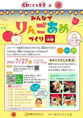 一般社団法人 感動こども協会(所在地:東京都新宿区、以下、当協会)は協会正会員である株式会社タケル(本社:東京都港区)と、2024年7月27日(土曜)にリンゴアメ専門店「林檎堂」のこだわりリンゴを使った『みんなでりんごあめづくり体験』を感動こども食堂「ビストロアジル蒲田店」にて開催します。
