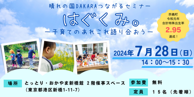 晴れの国DAKARAつながるセミナー『はぐくみ。―子育てのあれこれ語り合おう―』では、先輩移住者などの価値観を共有できる人とつながる機会の創出をめざし、座談会形式のセミナーとして実施します。