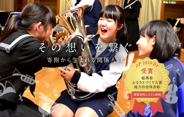 通常のふるさと納税と違い、本制度には「返礼品」と呼ばれるものがなく、児童・生徒たちからの「感謝の手紙」や演奏会への招待等が届きます。返礼品目的ではなく純粋に応援する想いから生まれる楽器寄附は「ふるさと納税の本質を捉えた制度」として、2020年度には「総務省ふるさとづくり大賞 地方自治体表彰」もいただきました。
