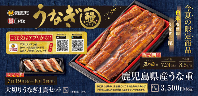 寿司レストランチェーンを展開する元気寿司株式会社(本社:栃木県宇都宮市 代表取締役社長執行役員 東 光法)は、2024年の土用丑の日「一の丑」である7月24日(水)、「二の丑」である8月5日(月)の2日間限定でお持ち帰り用に『鹿児島県産うな重』の販売を開始します。さらに、よりお手軽にうなぎを楽しめる『大切りうなぎ4貫セット』も7月19日(金)~8月5日(月)の期間限定で販売いたします。