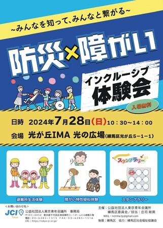 公益社団法人東京青年会議所練馬区委員会は、2024年7月28日(日)10時30分から練馬区地区事業『防災×障がい インクルーシブ体験会~みんなを知って、みんなと繋がる~』を光が丘IMA 光の広場イベントスペース(東京都練馬区光が丘5-1-1)にて開催します。