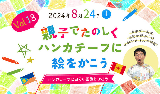 昨年好評のお絵描きテーマ「自分の国旗を描こう」が今年もカムバッグ!講師に地図・地理芸人として活躍中の小林知之さんをお招きし、世界中の国旗や世界地図に触れながら、国旗に込められたデザインの意味やカラーなどを学びます。そして、世界地図のハンカチーフに自分なりのオリジナル国旗を自由に描いたり、色を塗って完成します。