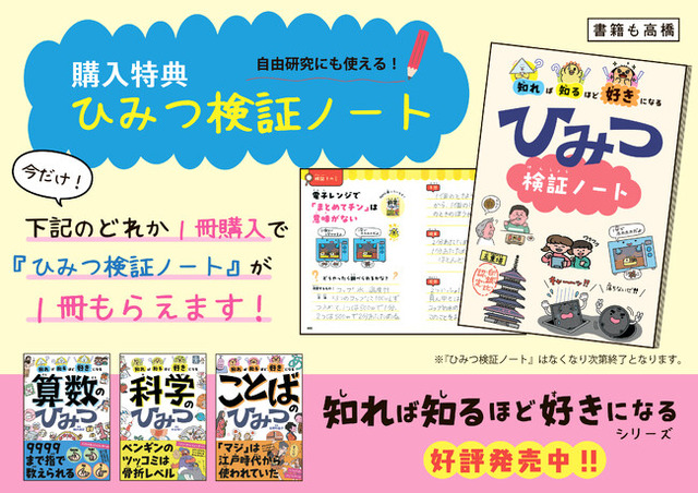 株式会社高橋書店(本社:東京都豊島区、代表取締役:清水美成)は、2024年7月23日(火)より全国約200店舗の書店にて、対象書籍を購入するとオリジナル『ひみつ検証ノート(非売品)』がもらえるキャンペーンを順次開始します。