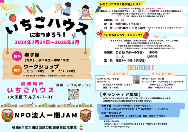 NPO法人一期JAMは、地域の子どもたちと住民が集まり、共に学び交流する「いちごハウスに集まろう!プロジェクト」の夏休み期間中のスケジュールを発表しました。