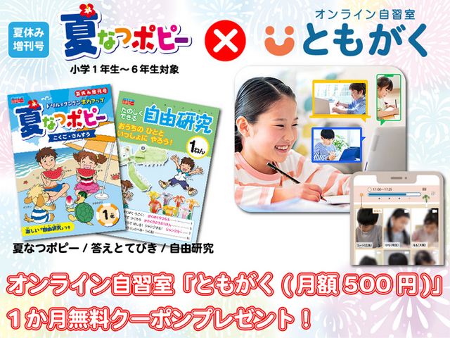 株式会社新学社(本社:京都市/代表取締役社長:山本 伸夫)は、小学ポピー夏増刊号「夏なつポピー」をお申し込みいただいた方全員に、家庭学習の習慣化に最適なオンライン自習室「ともがく」の1か月無料クーポンをプレゼントし、夏休み中の家庭学習の習慣化をサポートいたします。