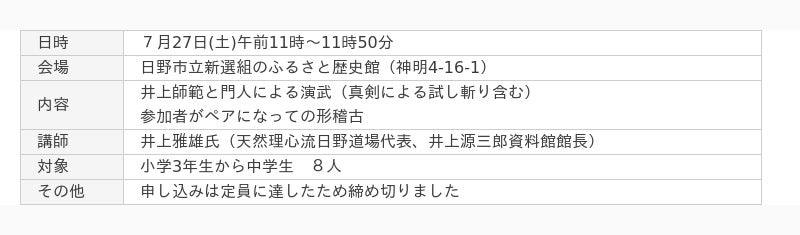 7月27日(土)午前11時から、新選組のふるさと歴史館で、小学3年生から中学生を対象に、井上源三郎の子孫で天然理心流日野道場を主宰する井上雅雄さんとその門人の方々を講師にお招きし、天然理心流入門講座を開催します。