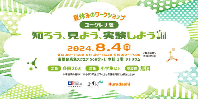 ソーシャルグッドマーケット「Kuradashi」を運営する株式会社クラダシ(本社:東京都品川区、代表取締役社長CEO:河村晃平、以下「クラダシ」)と株式会社ユーグレナ(本社:東京都港区、代表取締役社長:出雲充、以下「ユーグレナ社」)は、8月4日に青葉台東急スクエア(所在地:神奈川県横浜市青葉区)にて微細藻類ユーグレナ(和名:ミドリムシ、以下「ユーグレナ」)を題材に、サステナビリティについて学ぶワークショップを開催いたします。